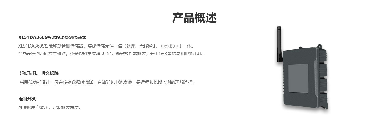XL51DA360S智能移動檢測傳感器,集成傳感元件、信號處理、無線通訊、電池供電于一體,產(chǎn)品在任何方向發(fā)生移動,或是傾斜角度超過15°,都會被可靠觸發(fā),并上傳報警信息和電池電壓。