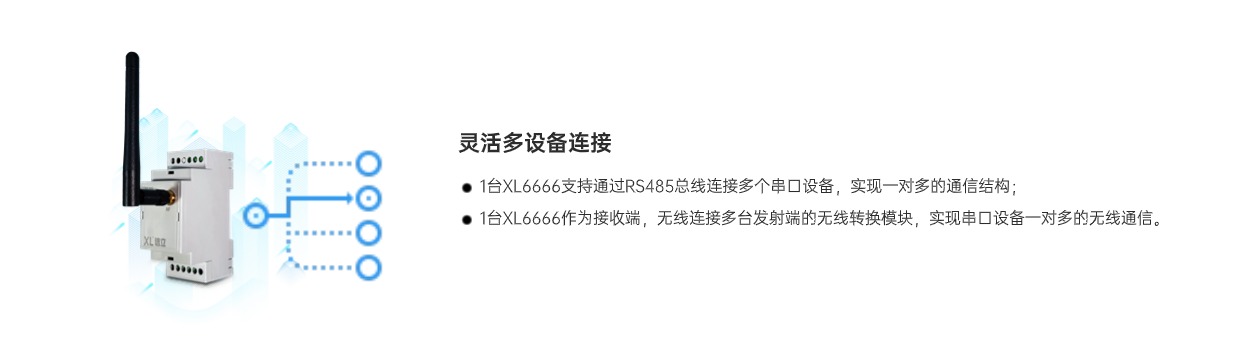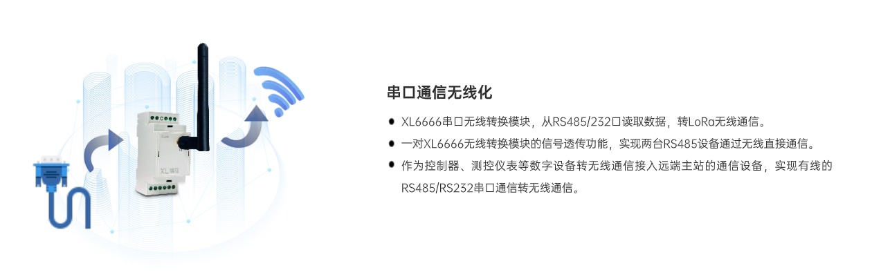 XL6666串口無(wú)線轉(zhuǎn)換模塊,作為控制器、測(cè)控儀表、智能設(shè)備等接入無(wú)線傳感網(wǎng)絡(luò)的節(jié)點(diǎn)裝置,將RS485串口通信轉(zhuǎn)換成LoRa無(wú)線通信,實(shí)現(xiàn)RS485通信口和LoRa無(wú)線通信相互轉(zhuǎn)換。有效解決設(shè)備間連接與數(shù)據(jù)傳輸?shù)葐?wèn)題,使傳統(tǒng)串口設(shè)備輕松融入物聯(lián)世界。