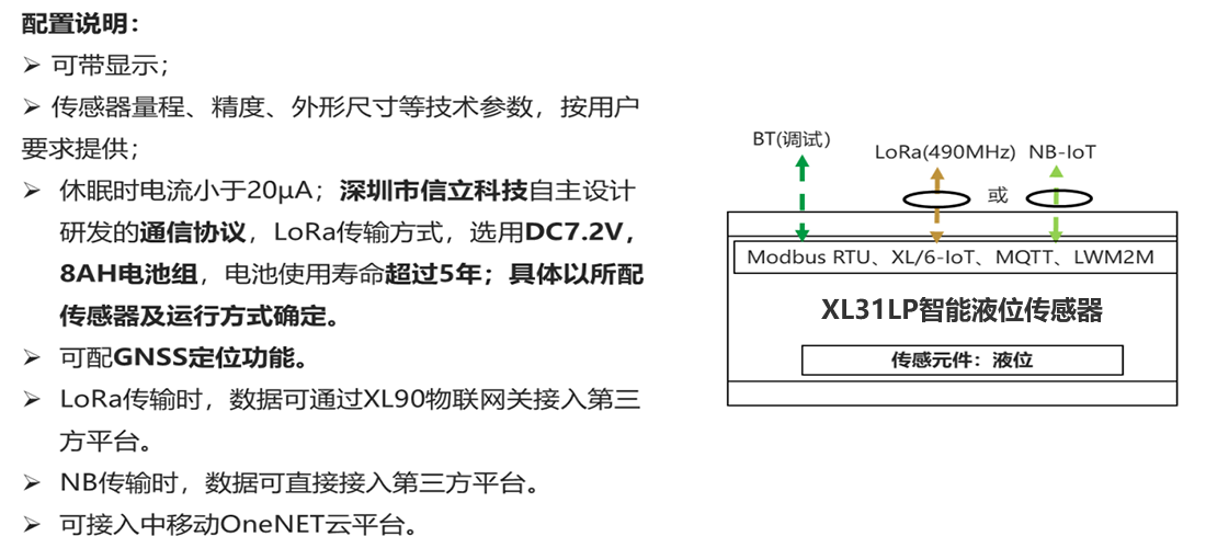 XL31LP智能液位傳感器,集成傳感元件、信息處理、無線通訊、電池供電等于一體。通訊中斷保存數(shù)據(jù),通訊恢復(fù)重傳數(shù)據(jù),超限主動(dòng)上傳數(shù)據(jù),電池能量低上傳報(bào)警數(shù)據(jù)。