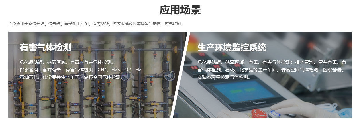 電子生產(chǎn)加工車間氟化氫(HF)監(jiān)測;充電間酸霧、氫氣(H2)監(jiān)測;氮氣儲罐區(qū)域氧氣(O2)監(jiān)測;?;反娣艆^(qū)、倉庫、污水處理池等場所有毒有害氣體監(jiān)測。