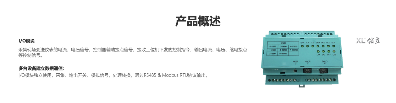 XL I/O模塊,采集模擬、開關信號,輸出模擬、開關信號,通過XBUS接口,接入XL80無線通信信主機,XL60無線采集裝置,或XL66串口無線轉換器。