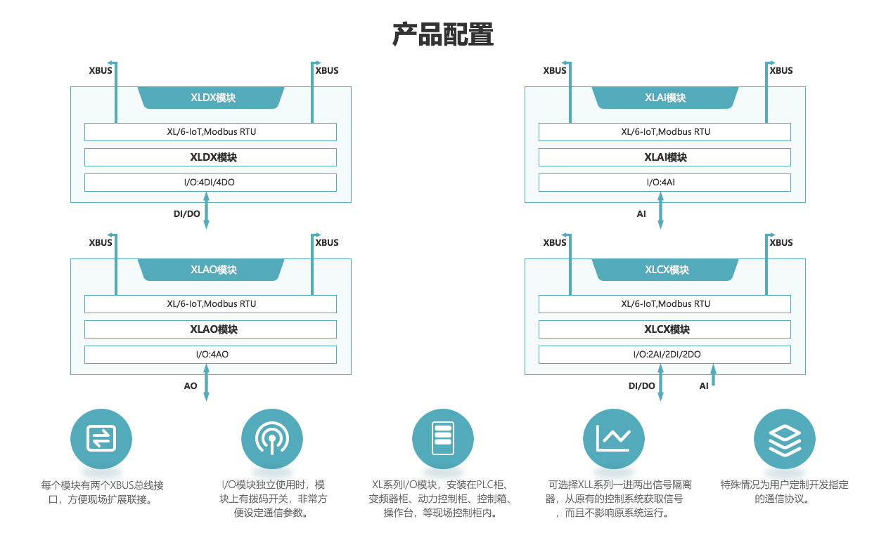 每個模塊有兩個XBUS總線接口,方便現(xiàn)場擴展聯(lián)接。XBUS可當作RS485口使用。I/O模塊上有撥碼開關,非常方便設定通信參數(shù)。可安裝在PLC柜、變頻器柜、動力控制柜、控制箱、操作臺,等現(xiàn)場控制柜內。