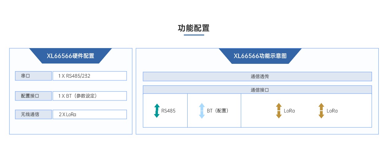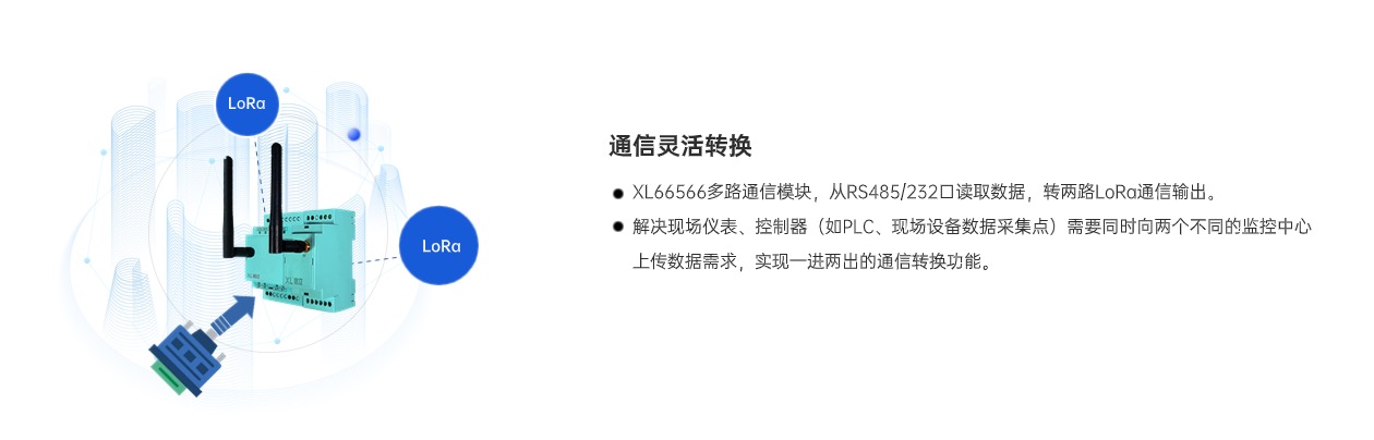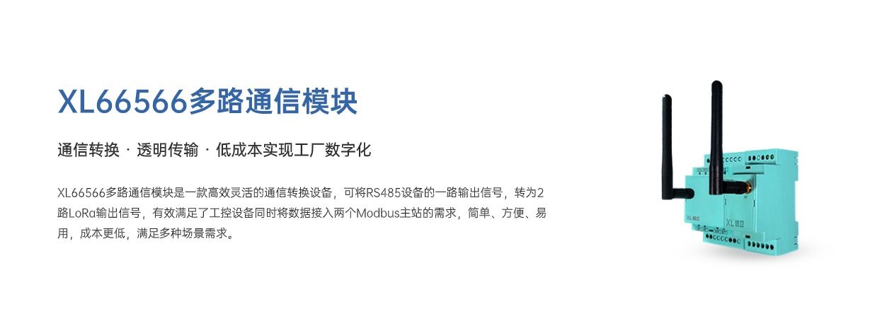 XL66566多路通信模塊是一款高效靈活的通信轉換設備,可將RS485設備的一路輸出信號,轉為2路LoRa輸出信號,有效滿足了工控設備同時將數據接入兩個Modbus主站的需求,簡單、方便、易用,成本更低,滿足多種場景需求。
