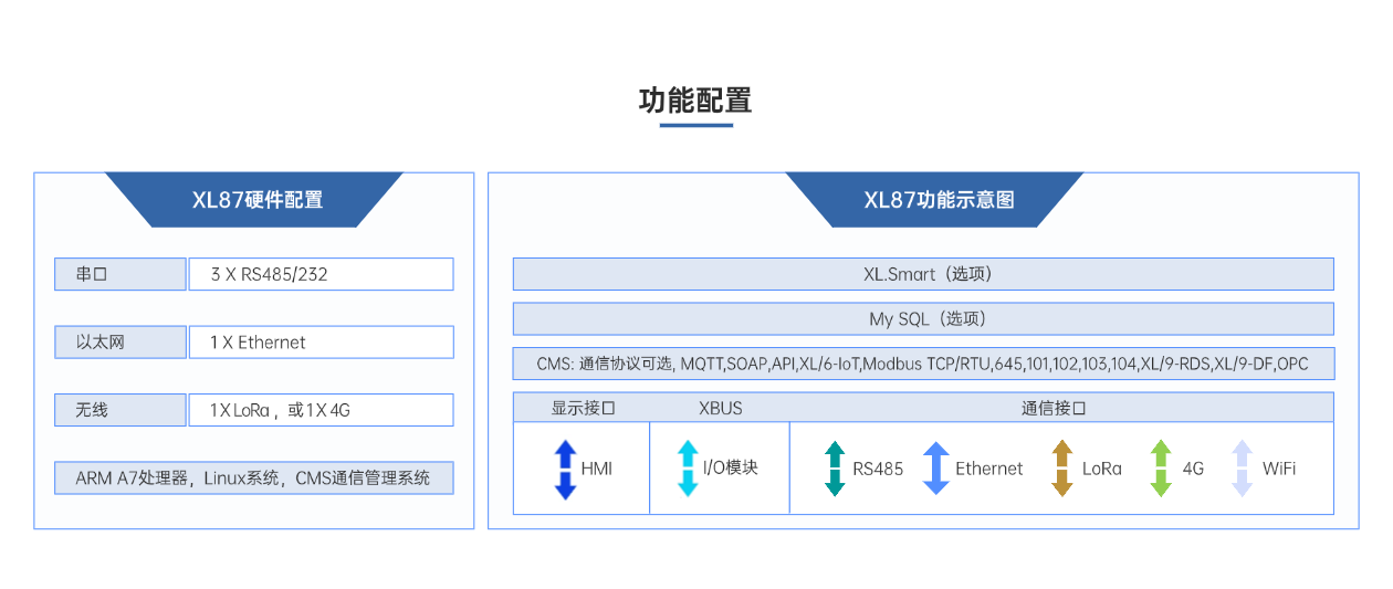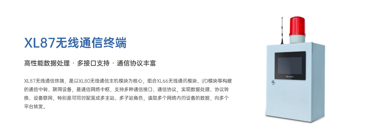 XL87無線通信終端,是以XL80無線通信主機模塊為核心,組合XL66無線通訊模塊、I/O模塊等構建的通信中轉、聯(lián)網設備,是通信網絡中樞,支持多種通信接口、通信協(xié)議,實現(xiàn)設備聯(lián)網,特別是可同時配置成多主站、多子站角色,讀取多個網絡內的設備的數(shù)據,向多個平臺轉發(fā)。