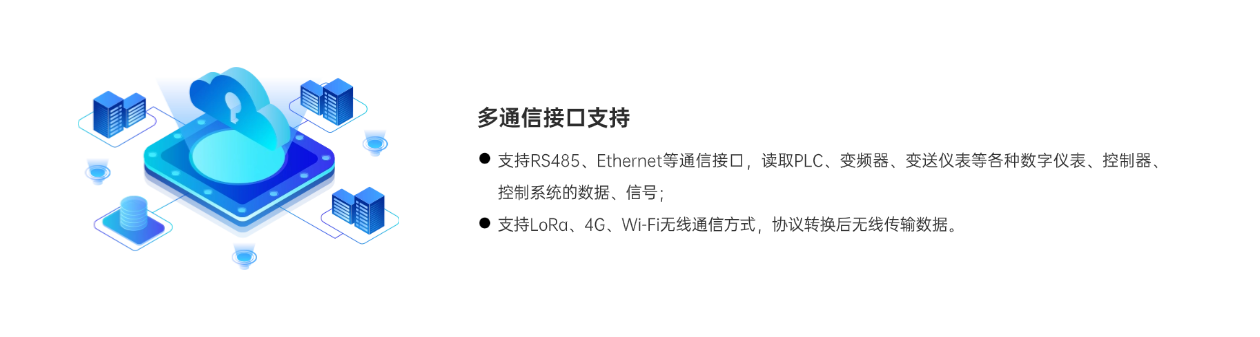 讀取PLC等各類控制器、工控儀表的數(shù)據,轉無線通信或聯(lián)網,并可同時向多個主站、平臺,發(fā)送數(shù)據;