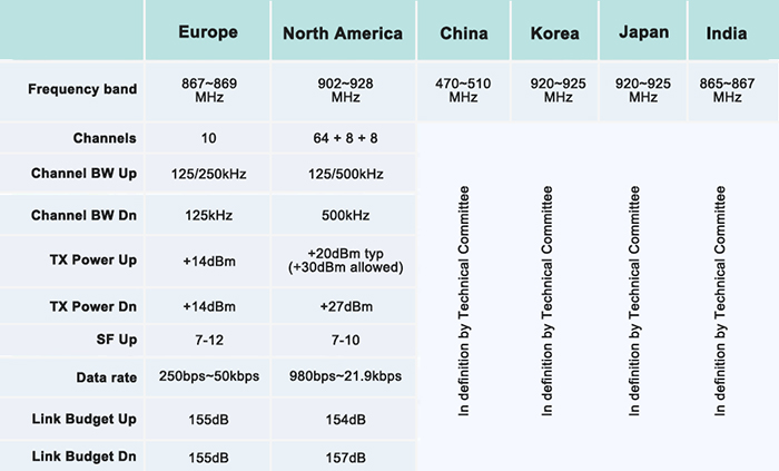 LoRa使用的是免授權ISM頻段,但各國或地區(qū)的ISM頻段使用情況是不同的。在中國市場,由中興主導的中國LoRa應用聯(lián)盟(CLAA)推薦使用了470-518MHz。而470-510MHz這個頻段是無線電計量儀表使用頻段。由于LoRa是工作在免授權頻段的,無需申請即可進行網(wǎng)絡的建設,網(wǎng)絡架構簡單,運營成本也低。LoRa聯(lián)盟正在全球大力推進標準化的LoRaWAN協(xié)議,使得符合LoRaWAN規(guī)范的設備可以互聯(lián)互通。下圖是LoRa聯(lián)盟規(guī)范里提到的部分使用頻段: