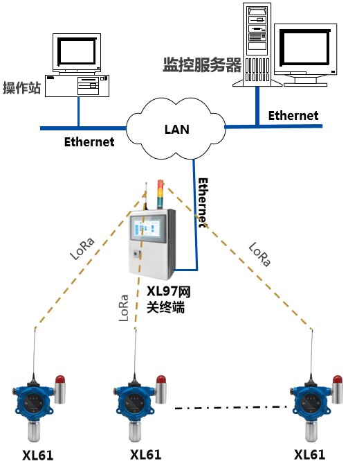 4、如增加現(xiàn)場集中監(jiān)控點(diǎn),可配置XL97網(wǎng)關(guān)終端,讀取區(qū)域內(nèi)XL61上傳的數(shù)據(jù),分析處理、顯示、報警,并轉(zhuǎn)發(fā)至監(jiān)控中心服務(wù)器。