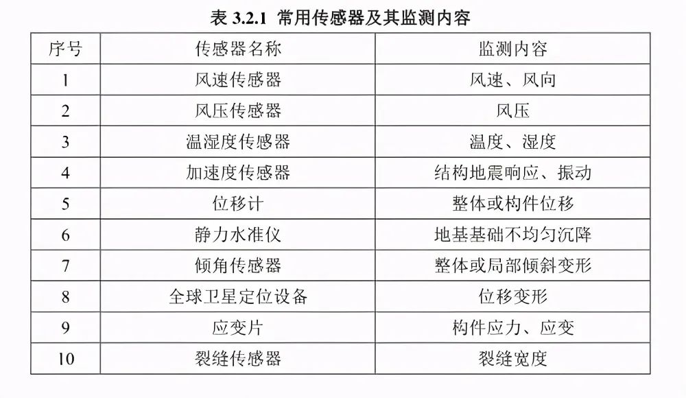 作為結(jié)構(gòu)檢測最為重要的內(nèi)容,傳感器起到了最為關(guān)鍵的作用。從結(jié)構(gòu)檢測常用的傳感器類型來看,風(fēng)速傳感器、風(fēng)壓傳感器、溫濕度傳感器、加速度傳感器、位移計(jì)、裂縫傳感器這些都是必備的,常用的傳感器及監(jiān)測指標(biāo)見下圖。