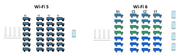 我們可以將路由器向設(shè)備傳輸?shù)膱鼍氨扔鞒梢粋€車隊,在WiF i5標準下,同一時刻出發(fā)車隊只能派送到一個客戶,即使有空車也照常發(fā)車,如果有車出現(xiàn)故障(受干擾),整個車隊都無法發(fā)車。而在WiFi 6標準下,同一時刻出發(fā)的一個車隊,可以將相鄰的最少26輛車組成一個小隊,每個小隊可以派送到不同的客戶,如果有車出現(xiàn)故障(受干擾)只影響所在的小隊。