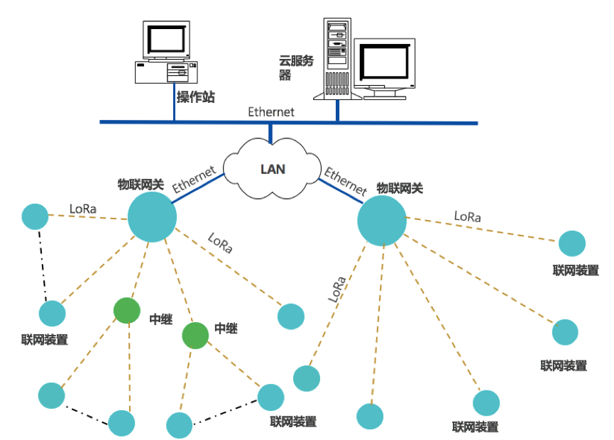 聯(lián)網(wǎng)裝置,采集設(shè)備運(yùn)行數(shù)據(jù),通過LoRa上傳數(shù)據(jù)至物聯(lián)網(wǎng)關(guān),網(wǎng)關(guān)通過Ethernet或Wi-Fi,接入云平服務(wù)器;