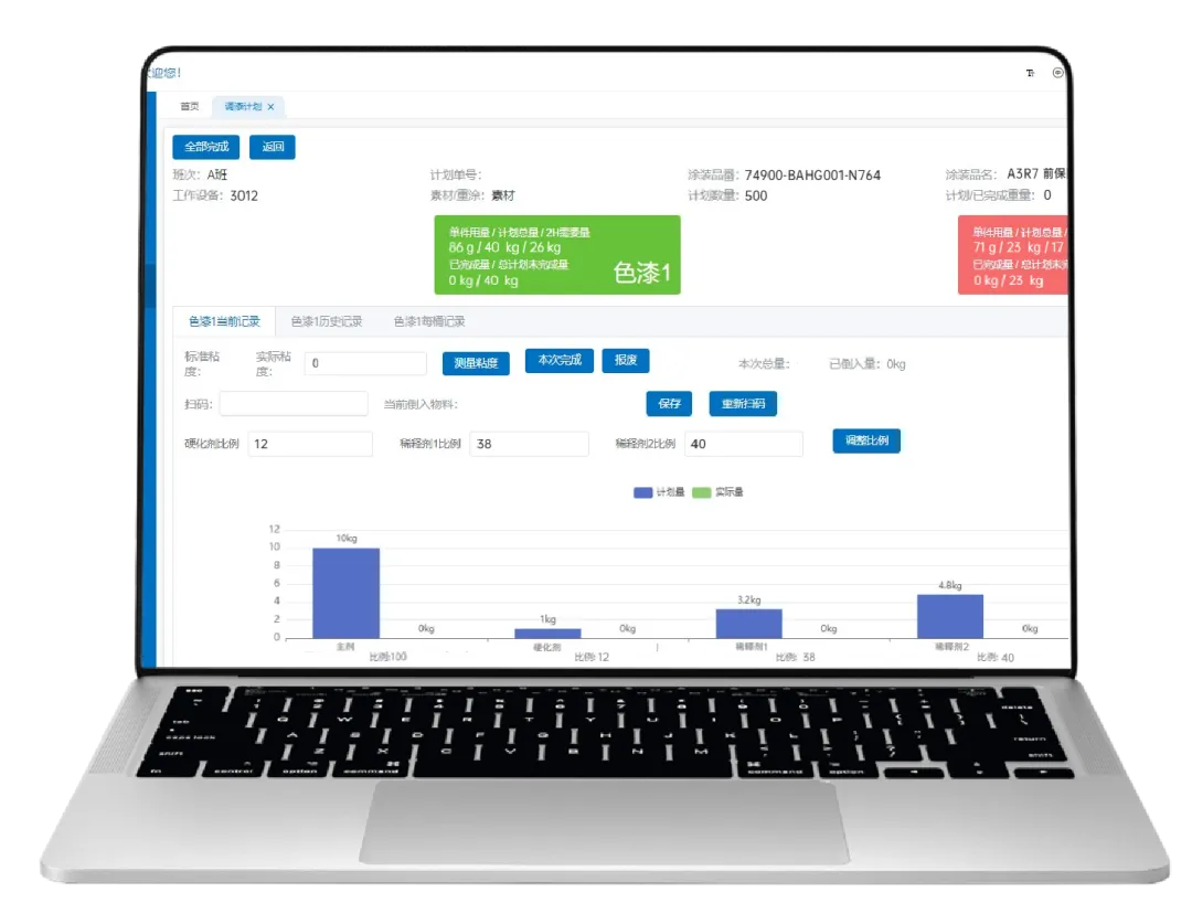 系統(tǒng)采用可視化直觀調(diào)漆界面設(shè)計,智能匹配調(diào)漆工藝,自動計算主劑、固化劑、稀釋劑需要的重量,以色塊的形式實時顯示已倒入的原料重量。