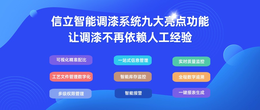 信立智能調(diào)漆系統(tǒng)XPMS,九大亮點功能設(shè)計,逐一解決調(diào)漆過程固有問題,降低對人的依賴,減少漆料浪費,更準確完整地計算統(tǒng)計漆料的使用及產(chǎn)出。