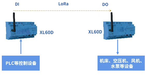 一對XL60D無線開關(guān)量對傳模塊,其中一臺與PLC等控制儀表連接,作信號發(fā)射端;一臺配置在生產(chǎn)現(xiàn)場,作信號接收端。發(fā)射端的XL60D將控制儀表的啟停命令,通過LoRa無線對傳到接收端,接收端的XL60D輸出開關(guān)量信號,控制設(shè)備啟、停。